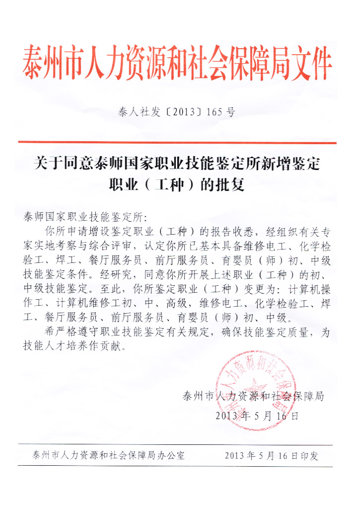 近日,泰州市人力资源和社会保障局经组织专家实地考察和评审,同意bat365国家职业技能鉴定所新增维修电工、化学检验工、焊工、餐厅服务员、前厅服务员和育婴师等职业(工种)的初中级技能鉴定。(沈红兵)