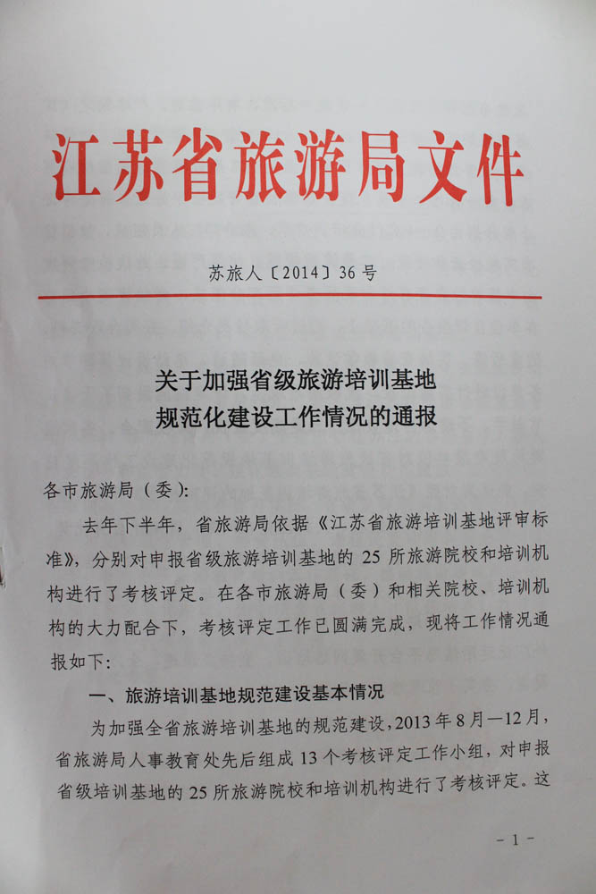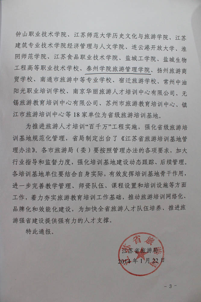 近日,江苏省旅游局发布了《关于加强省级旅游培训基地规范化建设工作情况的通报》,公布了通过正式考核评定为“江苏省旅游培训基地”的18家单位。其中,bat365在线中国官网登录入口旅游管理学院作为泰州市唯一的省级旅游培训基地,通过了江苏省旅游局的考核评定。