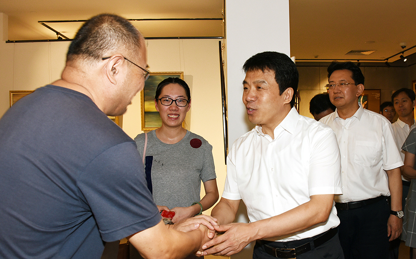 在美术馆,史立军一行近距离欣赏了美术学院绘画(师范)专业首届毕业生的毕业作品,对学生展现出的高水平表示赞许,对指导老师倾注的心血表示肯定,对今年新开设的书法专业表示期待。他还详细了解了漆画的制作过程,与美术学院黄平院长、袁俊华教授等交流学生作品创作情况。