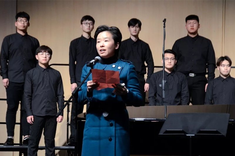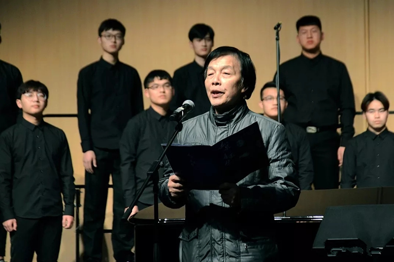 江苏省音乐家协会合唱联盟副主席苏永进在演出前宣读了江苏省音乐家协会合唱联盟的贺信。中国合唱协会副理事长、中国高校合唱委员会主席、著名指挥家任宝平教授,作曲家周国歧,来自全国各地的音乐家、省内其他高校的合唱指挥老师,以及泰州的千余名音乐爱好者共同欣赏了本场音乐会。(音乐学院)