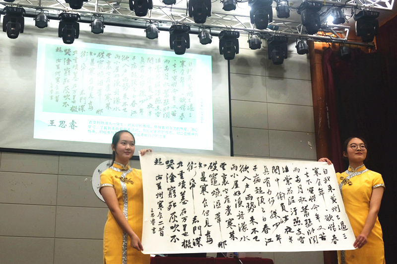 中国书法家协会会员、广州美院在读研究生邓文冲提供的书法作品,作为第一件拍卖品挂出。“拍卖师”——15级绘画专业王甜甜同学,介绍完作者以及作品后,刚发出“请大家出价”的指令,台下就有人直接喊出“1000元”的报价,该作品最终以1100元成交。