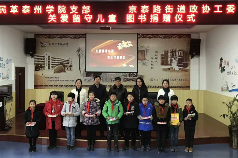 12月27日下午,bat365民革支部主委丁明带领民革党员同志走进实验小学育才路校区,举办“爱心图书捐赠”公益活动,向留守儿童赠送价值1500元的英文绘本图书。海陵区京泰路政协工委主任周玉金,泰州市实验小学校长丁正后、执行校长姜建宇参加了捐赠仪式。