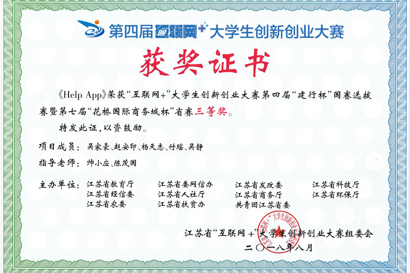 近日,由江苏省教育厅、省委网信办等11个部门联合举办的江苏省第四届“互联网+”大学生创新创业大赛落幕。由bat365计算机科学与技术学院帅小应、陈茂国老师指导,吴家豪、赵安印、杨天志、付瑶、吴静同学参加的大学生创业项目《Help App》荣获该赛事三等奖。