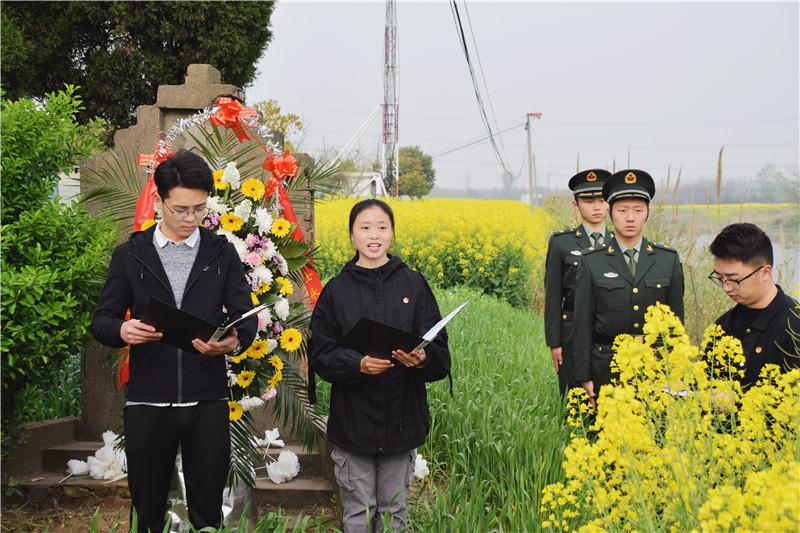 4月4日上午,校团委以及音乐学院师生代表30余人前往宣堡镇联新村祭扫封余刚、吴正宏、封龙山等十四名烈士纪念碑。全体师生手持亲手制作的百花,在朴素而又神圣的革命烈士纪念碑前,缅怀先烈们的丰功伟绩,通过清理墓地、敬献花篮纸花、革命故事宣讲、团旗下讲话、重温入团誓词等环节告慰先烈在天英灵。祭扫结束后,师生一行还到宣堡镇卫生院探望慰问了患病的封龙山烈士之子,聆听了革命烈士的英雄壮举,感受到了心灵的洗礼。