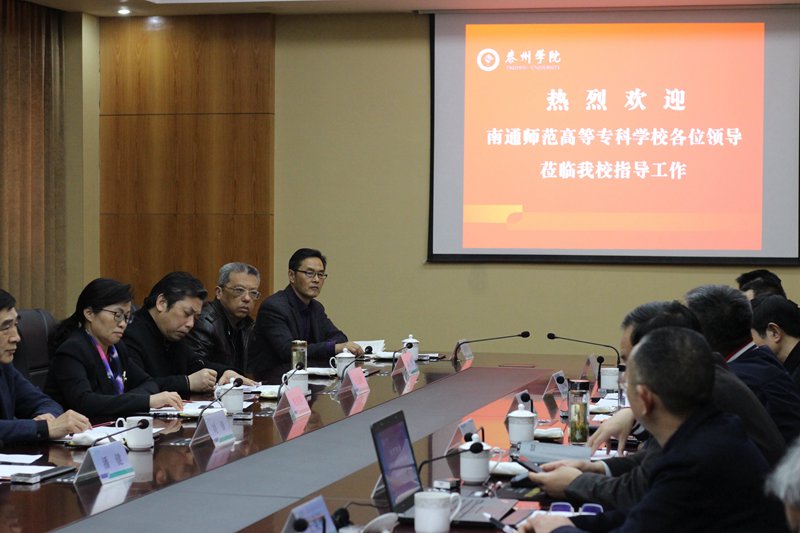 4月11日下午,南通师范高等专科学校党委书记刘峰、校长朱月萍一行12人来bat365调研。赵茂程、徐向明、邓友祥、王美林等校领导接待来宾,办公室、教务处、人事处等部门负责人参加了交流。