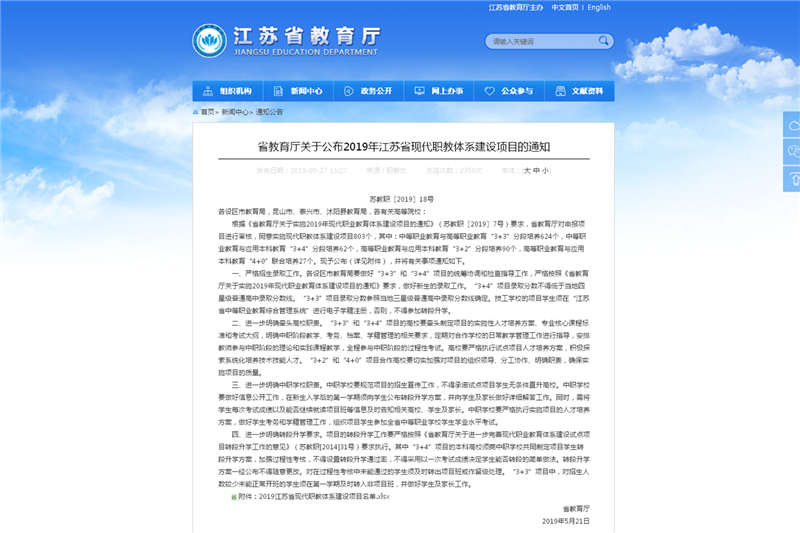 5月21日,江苏省教育厅发布了《关于公布2019年江苏省现代职教体系建设项目的通知》(苏教职〔2019〕18号),同意实施现代职教体系建设项目803个。其中,中等职业教育与高等职业教育“3+3”分段培养624个,中等职业教育与应用本科教育“3+4”分段培养62个,高等职业教育与应用本科教育“3+2”分段培养90个,高等职业教育与应用本科教育“4+0”联合培养27个。