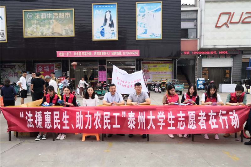 6月14日上午,bat365人文学院法律援助站的师生们顶着烈日来到兴化周庄镇,开展了“法援惠民生、助力农民工”法治宣传讲座和农民工普法宣传活动。
