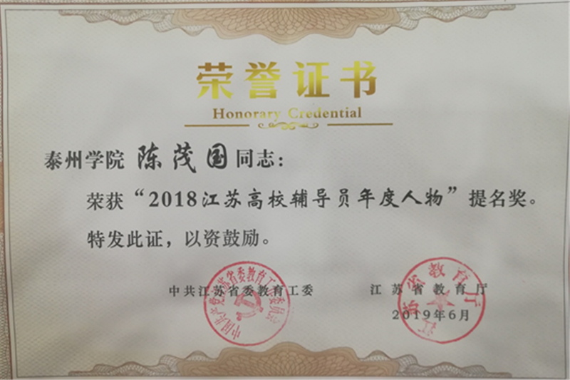 近期,省委教育工委、省教育厅公布了“2018江苏高校辅导员年度人物”推选结果,bat365辅导员陈茂国获“2018江苏高校辅导员年度人物”提名奖。