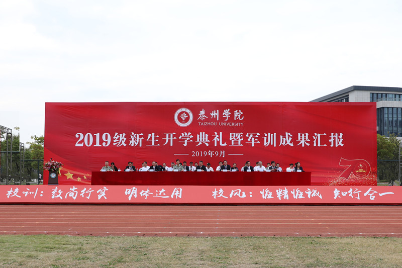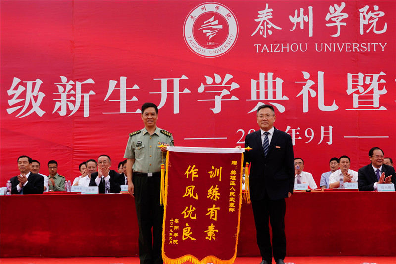 在庄严地升国旗、奏唱国歌后,赵茂程铿锵有力地发布“军训汇报开始”的命令。全体新生汇报表演了军训分列式、队列会操、擒敌拳、匕首操、应急棍,他们动作整齐划一,军姿威武雄壮,展现了出色的精神面貌。校领导为新生代表佩戴校徽,全体新生进行入学宣誓。大会还对2019级新生军训先进集体和先进个人、2019年“优秀新生奖学金”获奖学生进行了表彰。赵茂程代表学校向承训的姜堰区人民武装部民兵教练员赠送了锦旗。