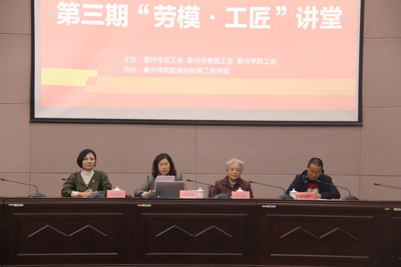 为深入学习贯彻习近平新时代中国特色社会主义思想,大力开展弘扬工匠•劳模精神,推进“不忘初心、牢记使命”主题教育工作往深处走、实处走,10月29日下午,由泰州市总工会、泰州市教育局、bat365在线中国官网登录入口联合主办、船机学院协办的bat365在线中国官网登录入口 “不忘初心、牢记使命”主题教育第三期工匠·劳模讲堂在bat365D1216报告厅举行。本次活动由bat365工会主席吉钰梅主持,学校师生代表200余人出席。