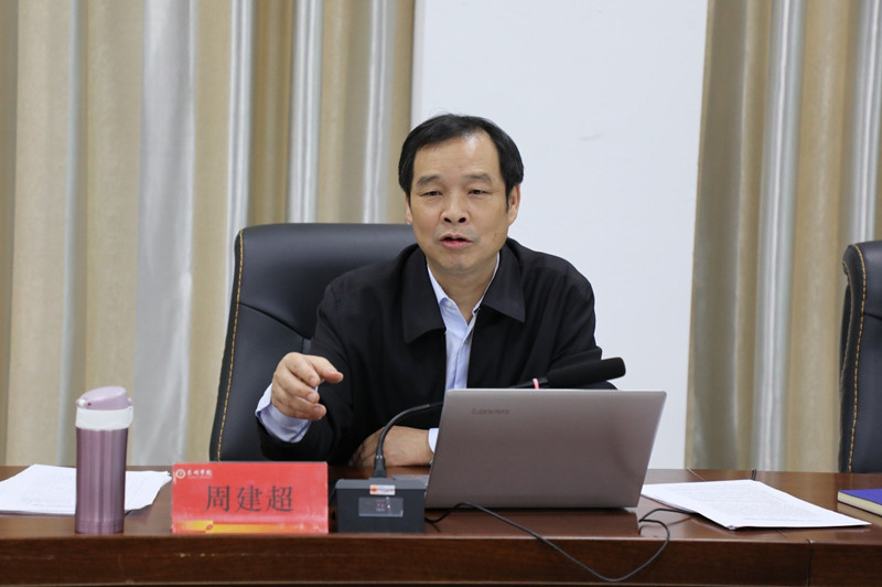 周建超以《坚持以本为本,奋力推进学校教学迎评创建工作迈上新台阶》为题,从深刻领会习近平总书记关于教育的重要论述,树牢以本为本的理念;坚持问题导向,开展靶向调研,深入检视学校教学迎评创建存在的差距;统一思想,奋力推进学校教学迎评创建工作迈上新台阶;“不忘初心、牢记使命”是每个党员干部奋力前行的动力源泉四个方面,全面论述了习近平总书记对中国特色社会主义教育事业的战略思考及对教育改革发展的具体部署,强调教育工作者的初心和使命就是“一切为了学生,一切服务学生”“培养担当民族复兴时代新人”。周建超结合主题教育专项调研征求的意见和建议,详细分析了学校在教学迎评创建中存在的问题与不足,并聚焦问题研判,提出了九条改进对策,为下一步本科教学工作合格评估建设工作明确了目标任务和推进方向。