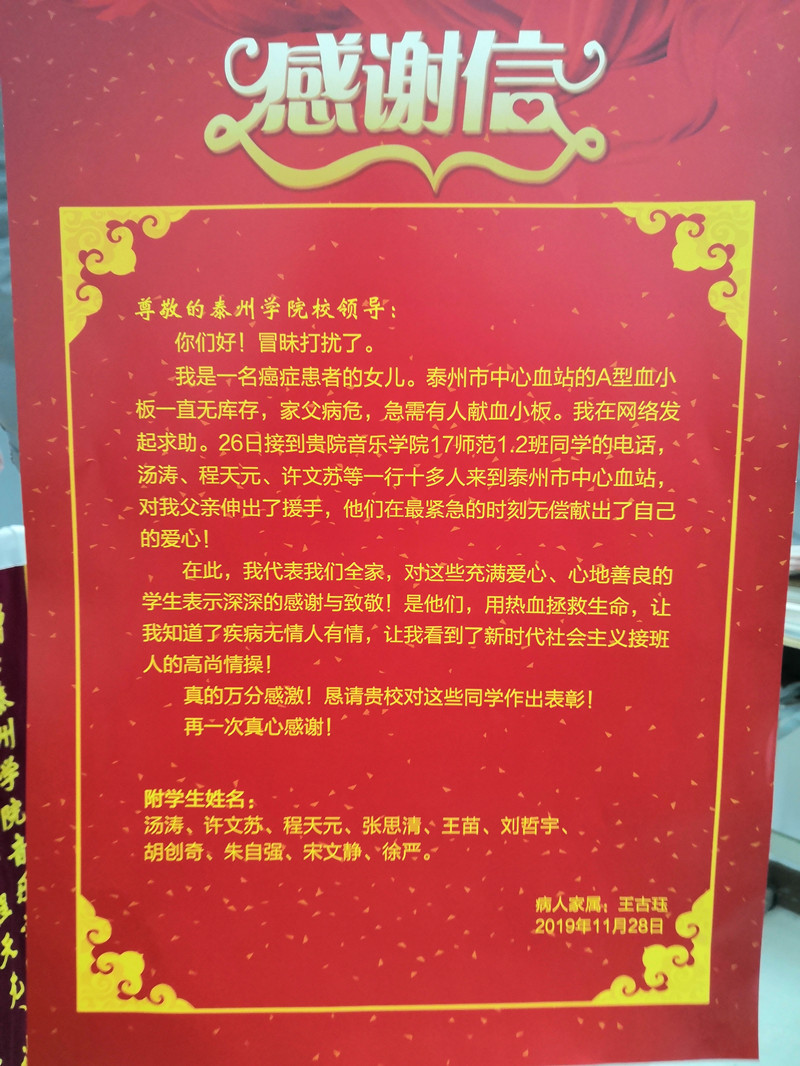 经了解,11月26日,由于身患癌症的父亲生命垂危,急需的A型血小板没有库存,王吉珏在网络上发起求助。当日,音乐学院任思源老师得知消息后,立即向17级音乐师范1、2班的学生发出紧急倡议。两个班随即在线上举办了一次特殊的主题团日活动,呼吁同学们奉献爱心和热血,传递关爱和温暖。截止到11月27日凌晨两点,共有10多名符合要求的同学报名。11月27日清晨7点45分,在任思源的带领下,张思清、许文苏、程天元、汤涛、王苗、刘哲宇、胡创奇、朱自强、宋文静、徐严等同学匆匆赶往泰州市中心血站。经过一系列的检查、化验,最终许文苏、汤涛、和程天元同学符合捐献要求,历时将近三个小时,共采集出4个单位的血小板。