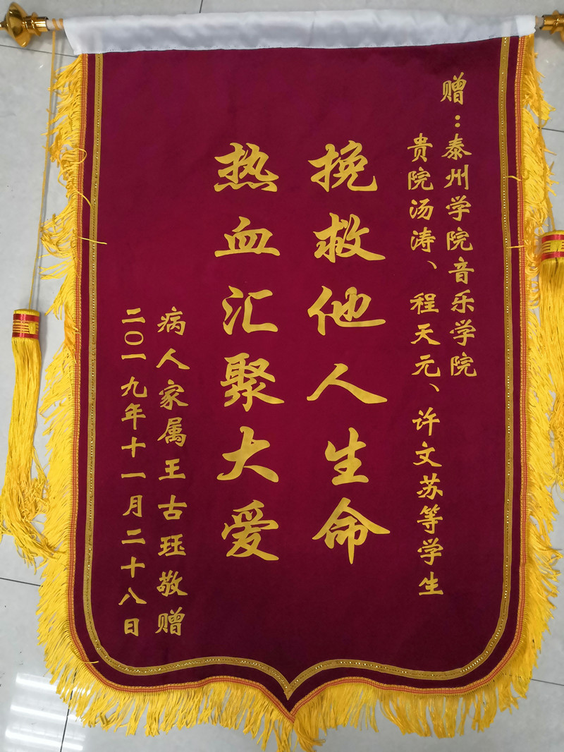 得到“救命”血小板的王先生病情很快缓解下来。为了感谢这些做好事不留联系方式的大学生,王吉珏经过多方打听,找到了bat365在线中国官网登录入口音乐学院,并送上“热血汇聚大爱 挽救他人生命”的锦旗和感谢信。她在感谢信中这样写道:“我代表我们全家,对这些充满爱心、心地善良的学生表示深深的感谢与致敬!是他们,用热血拯救生命,让我们知道了疾病无情人有情,让我看到了新时代社会主义接班人的高尚情操!”