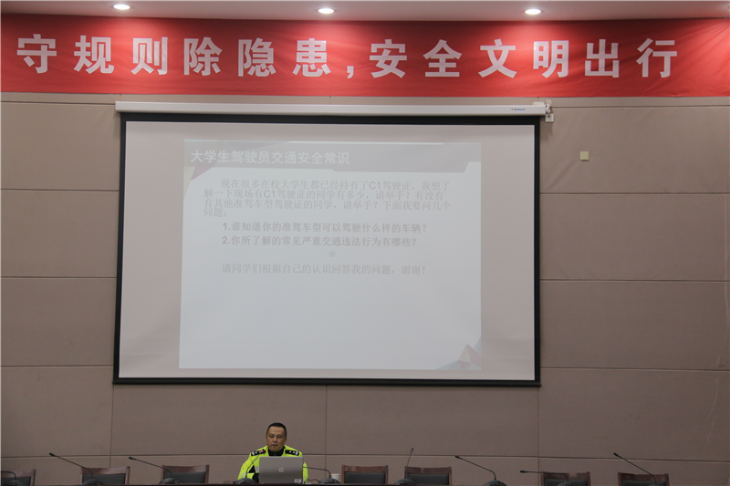12月2日是我国第八个交通安全日,为加强bat365大学生交通安全意识,丰富同学们交通安全知识,12月1日下午,保卫处和外国语学院邀请交警海陵大队教导员王宇和中队长吕李涛在行政楼D1216,为同学们举行了主题为“守规则除隐患,安全文明出行”的宣讲活动。