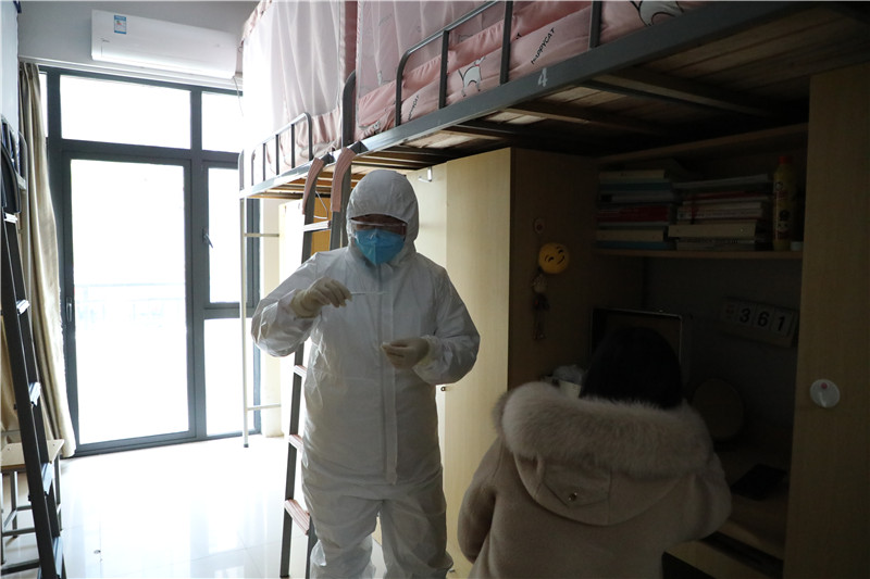 演练主要模拟一学生在宿舍有发热、咳嗽、乏力等症状并向辅导员报告后,学校防控领导小组启动应急预案并及时处置的全过程。演练项目包括疫情信息报送、宿舍楼层警戒和隔离管控、医护人员现场处置、病例转运、流行病学调查、密切接触者采样和隔离、密切接触者心理干预、病例宿舍终末消杀处理、后续处置等。