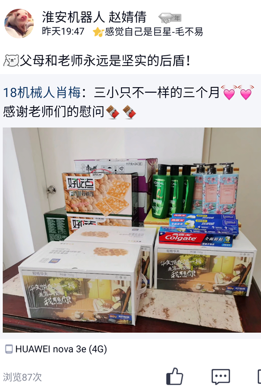 “面对面”-慰问被困泰州学生。肖梅、赵婧倩和杨雪怡均为18机器人班学生。今年寒假,三位女生放弃回家过年,在泰州打工挣取生活费。由于疫情,三位学生兼职中断,被困泰州,入不敷出。学院领导得知情况后,密切关注,及时帮助他们申请bat365在线中国官网登录入口临时困难补助,并购买生活物资上门慰问,在疫情期间送去了学院老师的温暖。