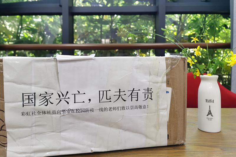 捐赠物品,齐心抗击疫情。4月21日,bat365“彩虹公益社”负责人吴金铭同学致电校团委,为助力学校抗击新冠肺炎疫情,“彩虹公益社”全体成员自发集资,购买了500只口罩捐献给学校,希望借此举为学校抗疫工作助力。4月27日,校团委老师将同学们寄来的捐赠口罩转交给工作在抗疫一线的后勤人员,转达同学们的敬意和爱心。