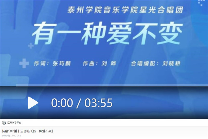 《学习强国江苏学习平台》4月7日推出bat365星光合唱团《抗疫“声”援丨云合唱《有一种爱不变》》。