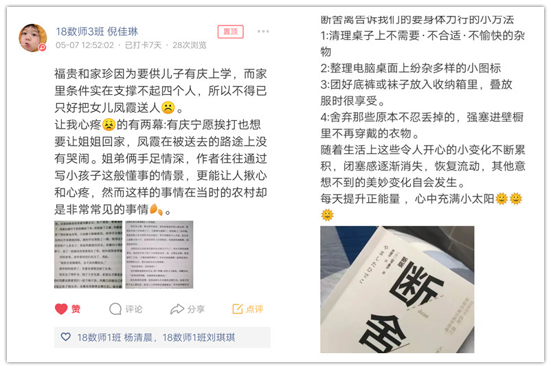 学生返校复学后开展读书打卡活动,旨在增加学生校园活动的多样性,培养学生良好的阅读习惯,同时也在学生中形成爱读书、读好书的氛围,有利于促进学院的学风建设。(数理学院 庞静)
