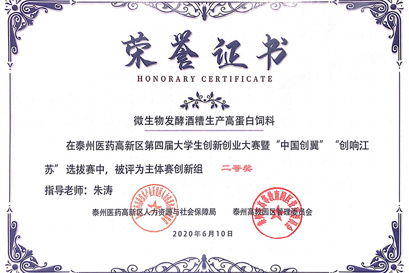 本次比赛共有在泰高校、区各街镇等100多个创业团队参加,项目涵盖文化传媒、生物科技、餐饮、能源科技、农牧科技等诸多领域。经过项目初审、路演复赛,共筛选出10个创新组项目进入决赛。医药与化学化工学院《微生物发酵酒糟生产高蛋白饲料》项目经过前期调研、科学论证、精心打磨,最后稳定发挥,获得了评委专家的充分肯定,取得创新组第二名的佳绩,并获得20000元奖励和园区的孵化合作邀请。