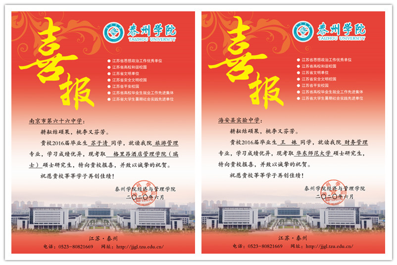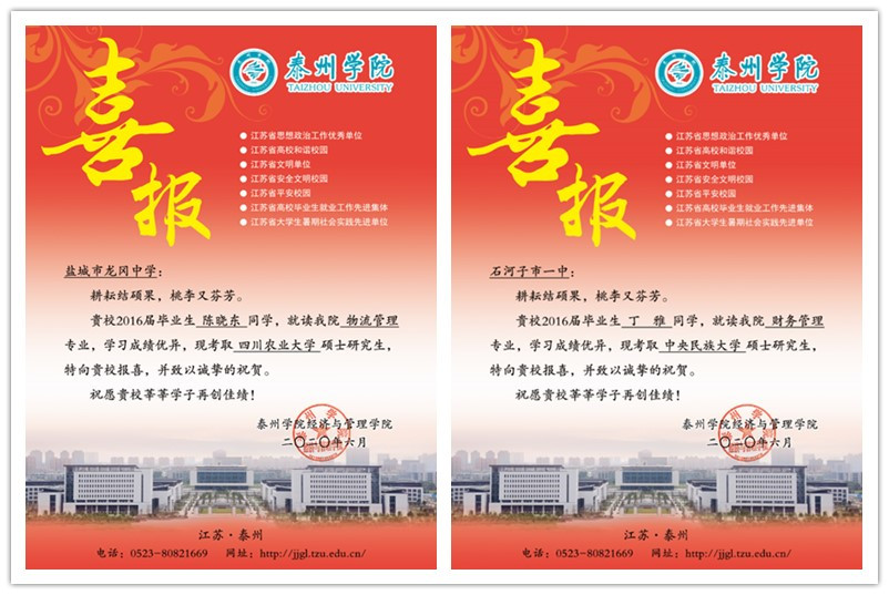 为扩大学院办学成效的影响力,学院制作了精美喜报,寄送至学院生源较集中的学校新疆石河子市一中、海安县实验中学、盐城市龙岗中学、南京市六十六中学等生源学校,为即将开始的高考招生做好准备,鼓励更多优秀学子报考bat365。(经管学院)