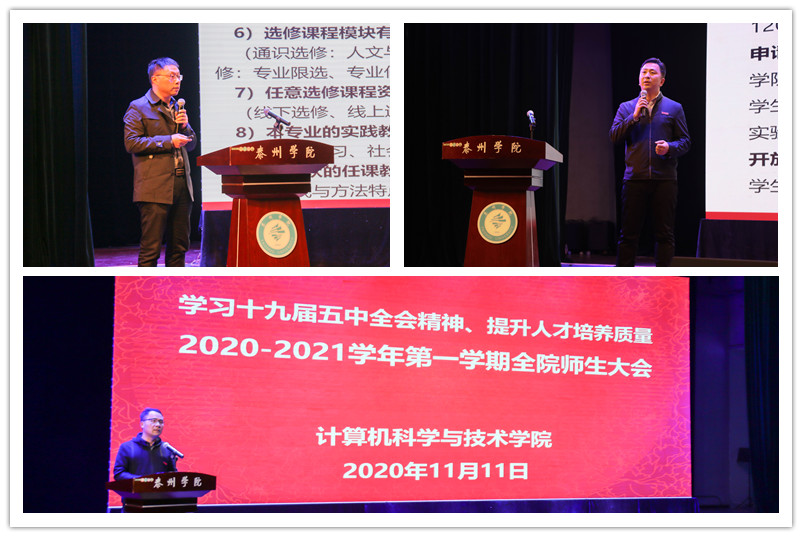 执行院长崔宝同立足于计科院基本情况,就学院的专业建设与人才培养方面的问题,从“学院办学定位、学科专业建设、人才培养体系、师资队伍建设、优良学风建设”五个方面向全院师生作了“多措并举、提质创新、全面提升应用型人才培养质量”的专题报告。