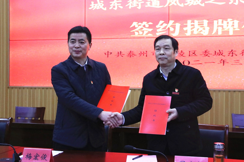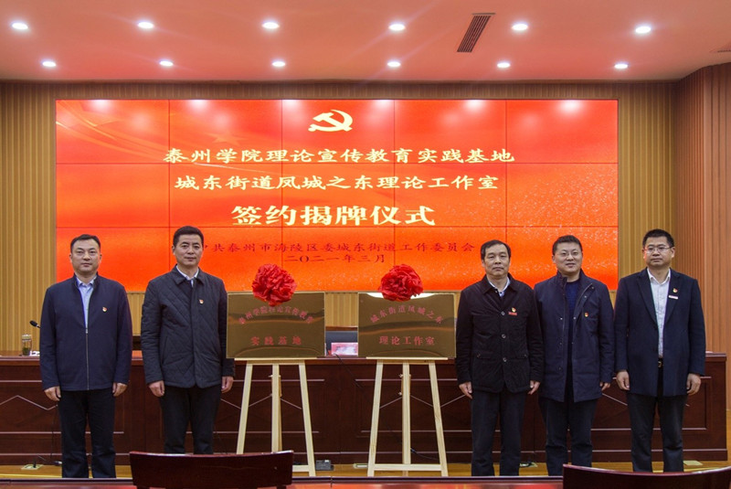 为深入学习贯彻习近平总书记在党史学习教育动员大会上的重要讲话精神,落实党和国家思想政治教育工作要求,3月16日上午,bat365与海陵区城东街道举行结对共建签约揭牌仪式。校党委常委、副校长周建超,城东街道党工委书记梅宏俊分别代表双方签订合作协议,共同为“bat365在线中国官网登录入口理论宣传教育实践基地”“城东街道凤城之东理论工作室”揭牌。
