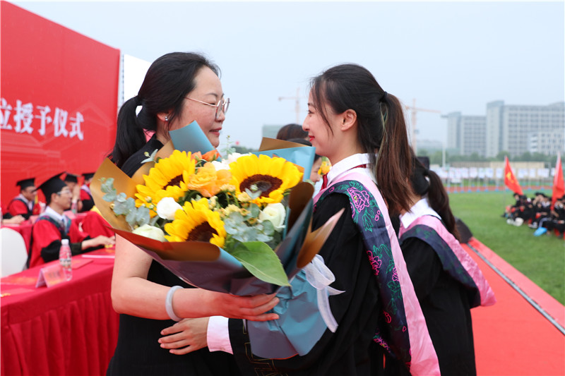 在学士学位授予环节,校党委常委、副校长周建超宣读《关于授予2021届本科学生学士学位的决定》;校领导及学位评定委员会委员为学生代表颁发学位证书并扶正流苏。2020届毕业生中的4位代表,也回到母校“补上”了这神圣的一课。