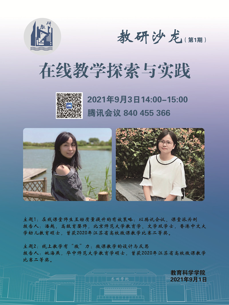 为了发挥线上教学“种子教师”的示范和带动作用,确保开学教学工作秩序平稳有序,根据教务处统一部署,9月3日下午,教育科学学院开展“在线教学探索与实践”主题教研沙龙。本期沙龙由获得2020年江苏省高校微课教学比赛二等奖的两位青年教师主讲,全校近80名教师共聚“云端”,同话教研。