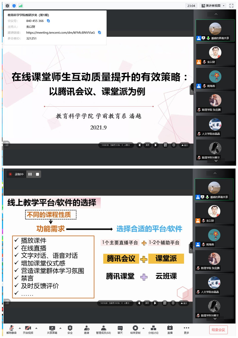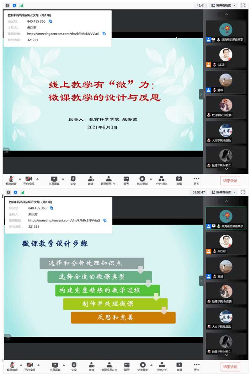 本次教研沙龙既有理论探讨,也有案例描述,教师们通过分享交流,有效地解决了线上教学中遇到的问题,为推进线上教学工作提供了助力。据悉,教育科学学院后续将充分发挥本院教师的示范作用,定期开展教研沙龙,促进教师在教学工作实践中不断探索和总结,提升学院整体教研水平。(教育科学学院)