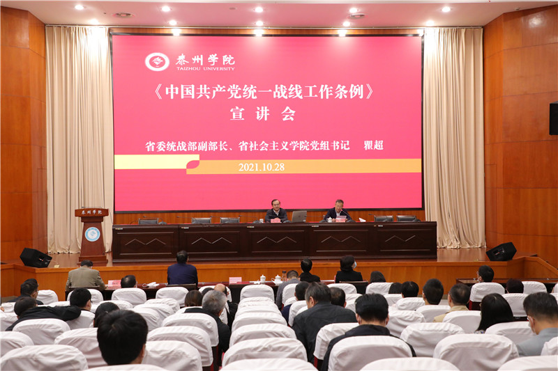 10月28日,学校在行政楼D1216会议室举办《中国共产党统一战线工作条例》宣讲会,江苏省委统战部副部长、省社会主义学院党组书记瞿超主讲,学校党委理论学习中心组成员、全体中层干部、二级党组织统战委员、基层党支部书记、各民主党派和统战团体负责人参加宣讲会。宣讲会由学校党委书记赵茂程主持。