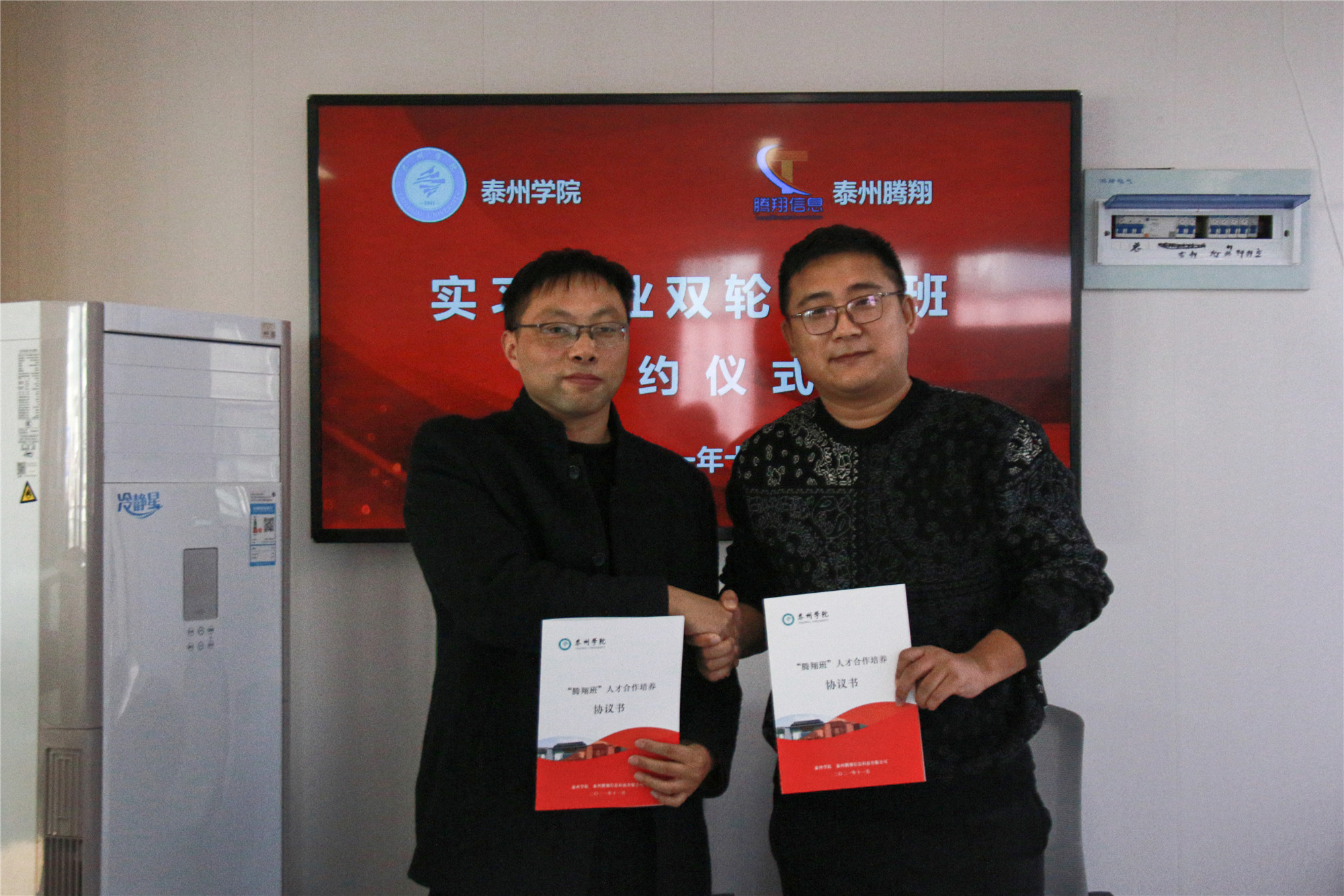 双方介绍了各自的情况,并就实习就业、课程嵌入等方面的合作进行了探讨。刘俊飞和教务处副处长彭海静共同签署了“腾翔班”人才合作培养协议书。