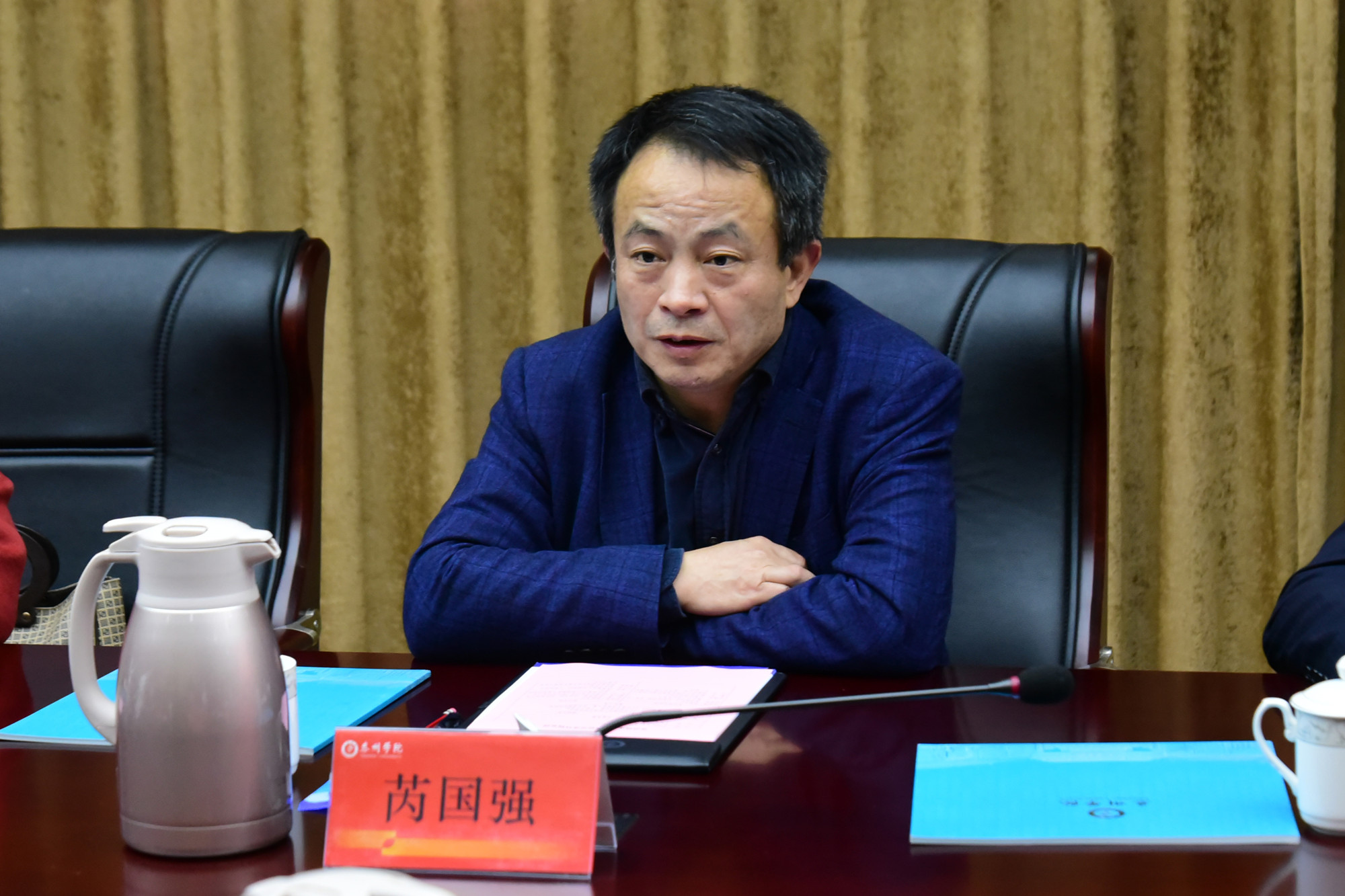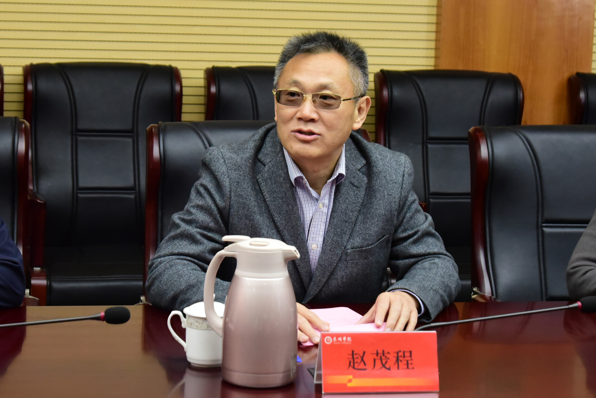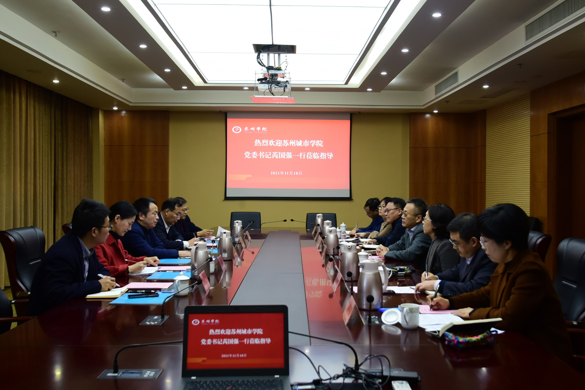 11月18日上午,苏州城市学院党委书记芮国强一行来校交流。校党委书记赵茂程、纪委书记吴菁出席交流会,办公室、组织部、机关党委、人事处、财务处、国有资产管理处等部门负责人参加交流。