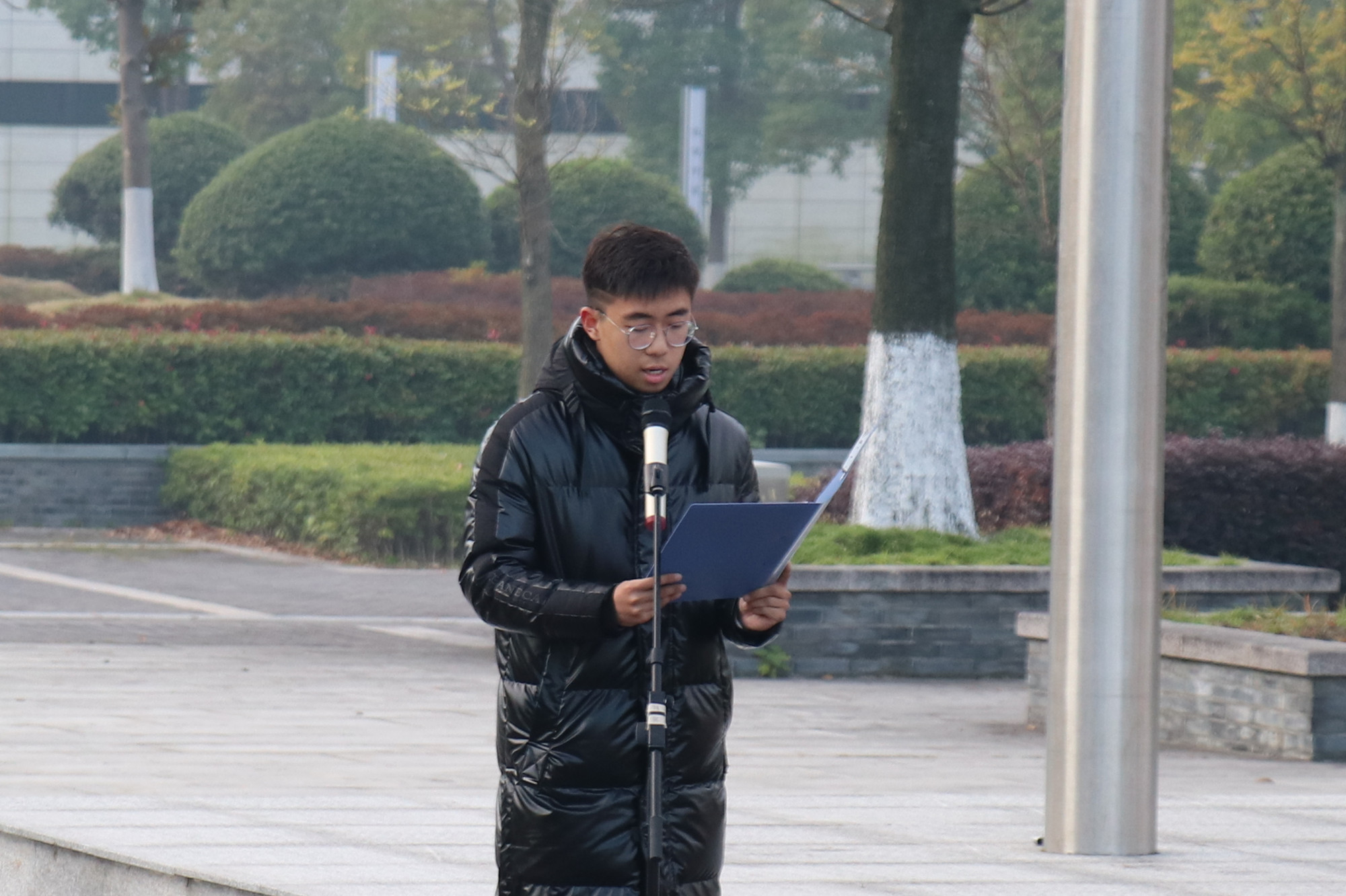 2021级网络与新媒体1班孙伟杰作为学生代表发言。侯晓涓、汤慧玲、陈子彧和孙伟杰带领同学们朗诵2019级汉语言文学师范3班范浩同学的原创诗歌《烈士忠丹——颂杨根思》。