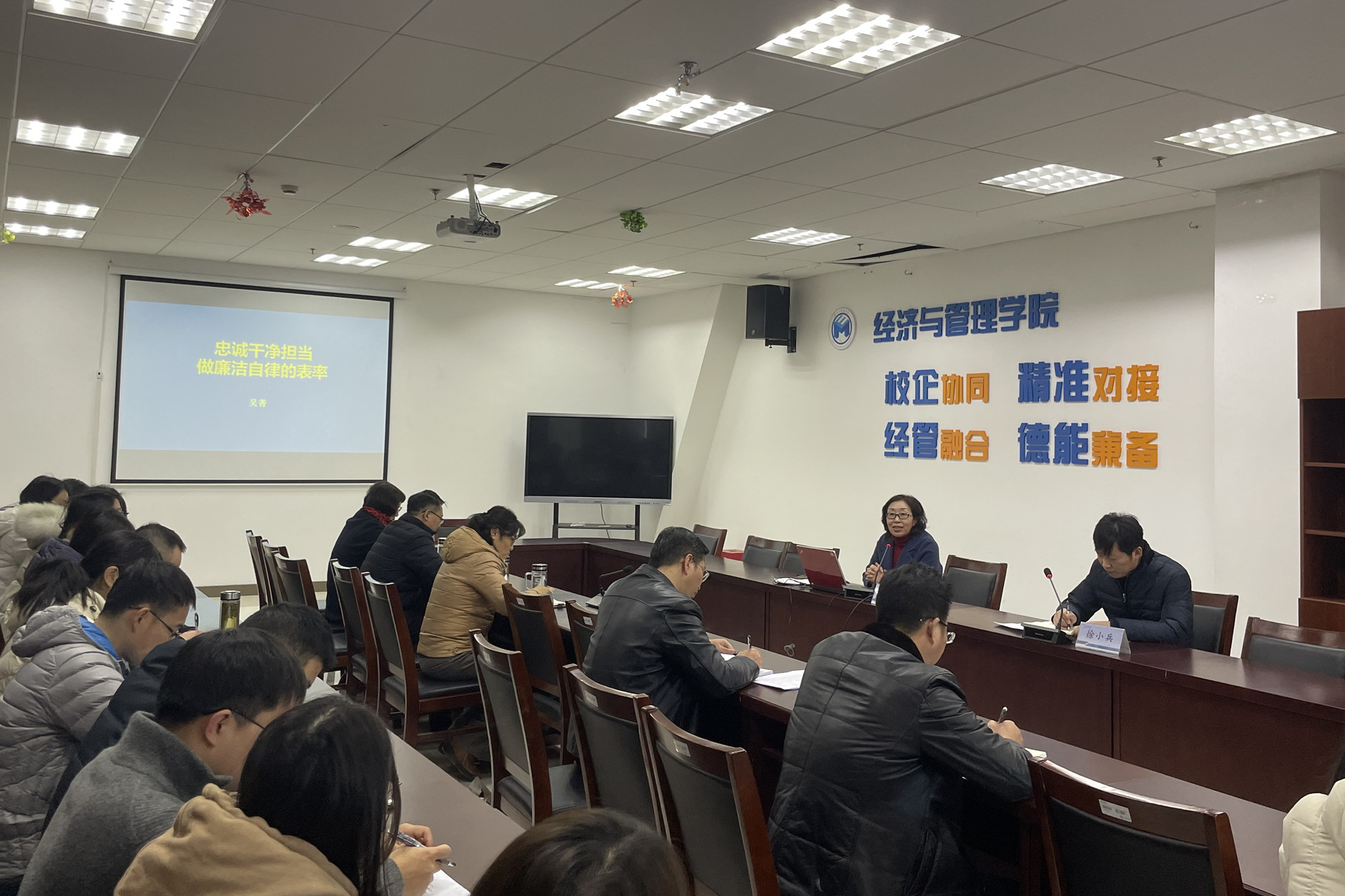 12月1日下午,校党委常委、校纪委书记吴菁为经济与管理学院全体教职工讲授题为《忠诚干净担当,做廉洁自律的表率》专题党课。