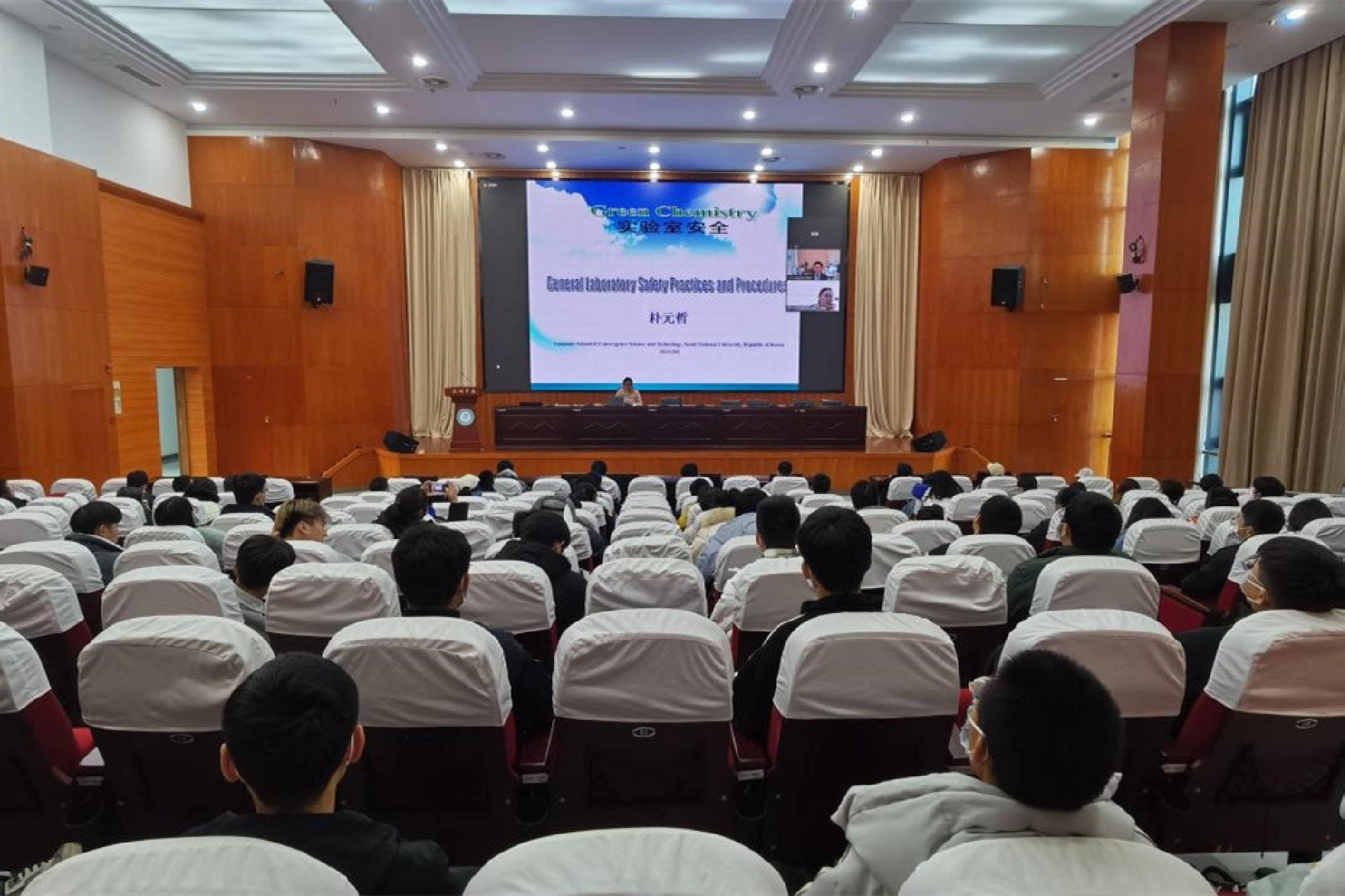 朴元哲介绍了各类化学药品和实验仪器的存放和使用,分析了实验室存在的多种危险因素,特别就危险化学品的操作以及废弃物处置规范、个人防护用品的使用以及意外发生时的急救常识进行了讲解。