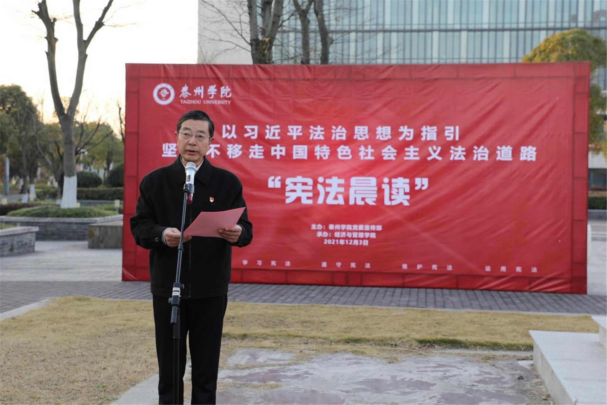 12月3日清晨,经济与管理学院300余名师生齐聚胡瑗广场,举办国家宪法日晨读活动。校党委副书记邓友祥,校党委常委、宣传部部长吕林出席活动。