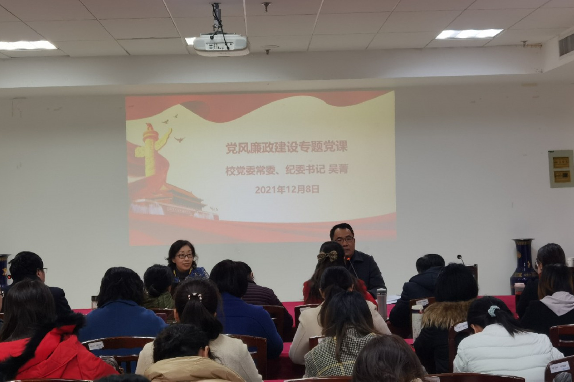 12月8日下午,校党委常委、纪委书记吴菁在外国语学院会议室D1326,为全院教职工开设题为《忠诚干净担当,做廉洁自律的表率》专题党课。
