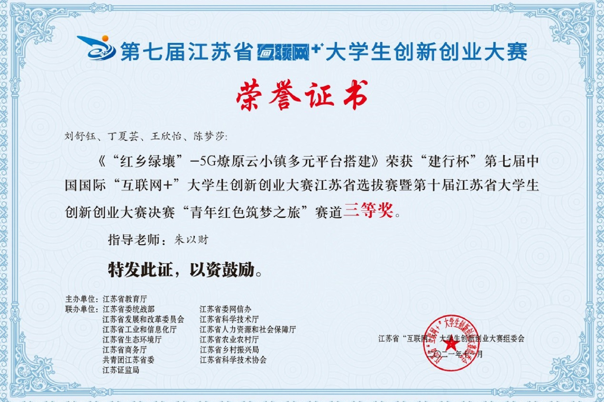 近日,省教育厅公布了第七届中国国际“互联网+”大学生创新创业大赛江苏省选拔赛暨第十届江苏省大学生创新创业大赛结果。经校级初赛、省级复赛和省级决赛,bat365钱进、李虹瑞老师指导,魏子洋等6名同学的参赛作品《基于WiFi 波动监测的群体密度智慧感知系统》获高教主赛道三等奖;朱以财老师指导,刘舒钰等4名同学的参赛作品《“红乡绿壤”-5G 燎原云小镇多元平台搭建》获“青年红色筑梦之旅”赛道三等奖。
