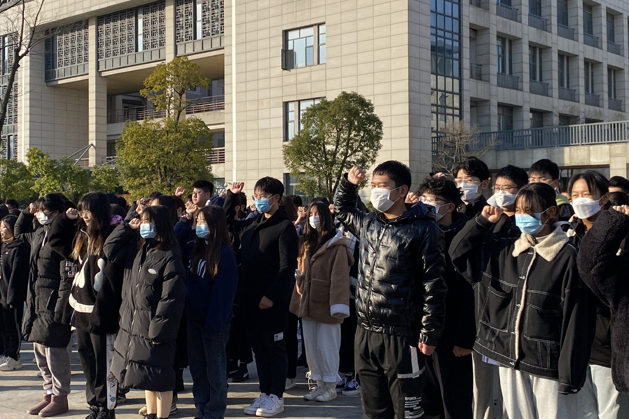首先是庄严的升旗仪式,大学生国旗护卫队步伐整齐,护卫国旗缓缓升起。升旗仪式结束后,全场师生向南京大屠杀死难者同胞默哀。