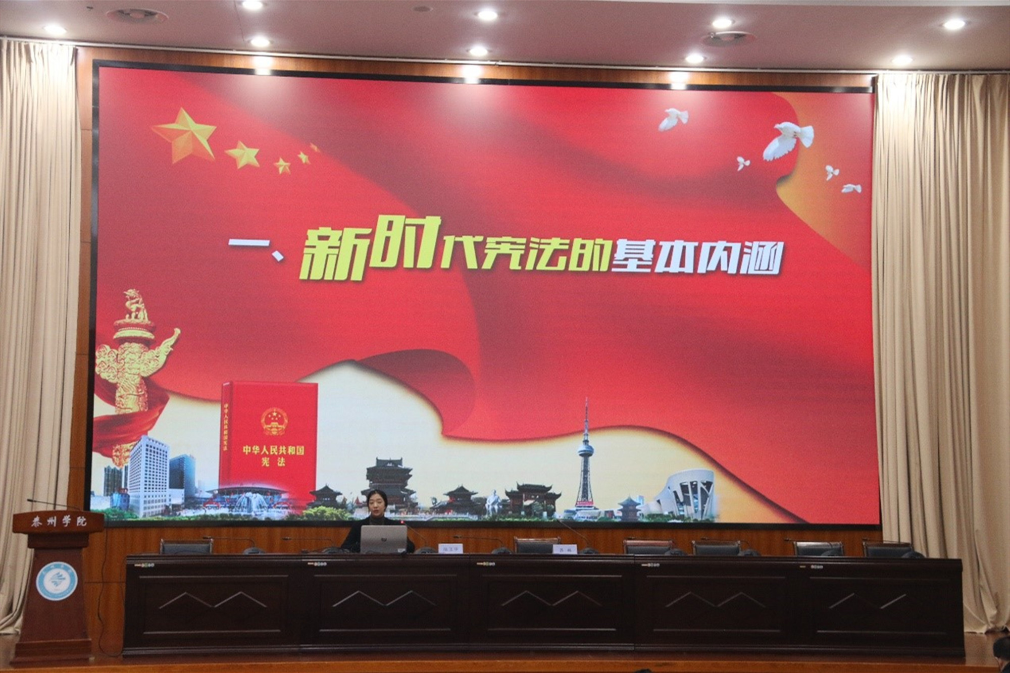 为学习宣传宪法,弘扬宪法精神,12月10日,经济与管理学院组织的宪法知识讲座在行政楼1216开展。讲座由泰州市司法局法宣处处长陆卫华主讲,校党委常委、宣传部部长吕林主持,来自各个学院的百余名学生参与了本次讲座。
