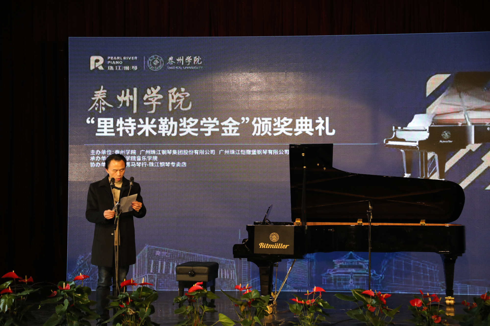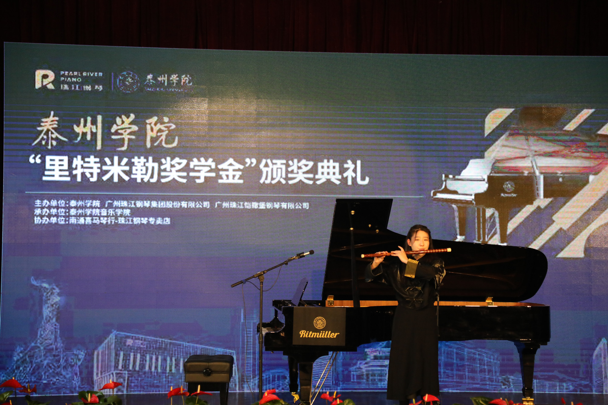 12月16日下午,音乐学院“里特米勒奖学金”颁奖典礼在艺术楼C2120举行。广州珠江钢琴集团股份有限公司总经理肖巍、音乐学院院长张承龙、党总支书记刘江元、党总支副书记陈小梅、泰州海韵文化传播有限公司总经理李敏等出席活动,音乐学院师生一起观看了此次颁奖音乐会。