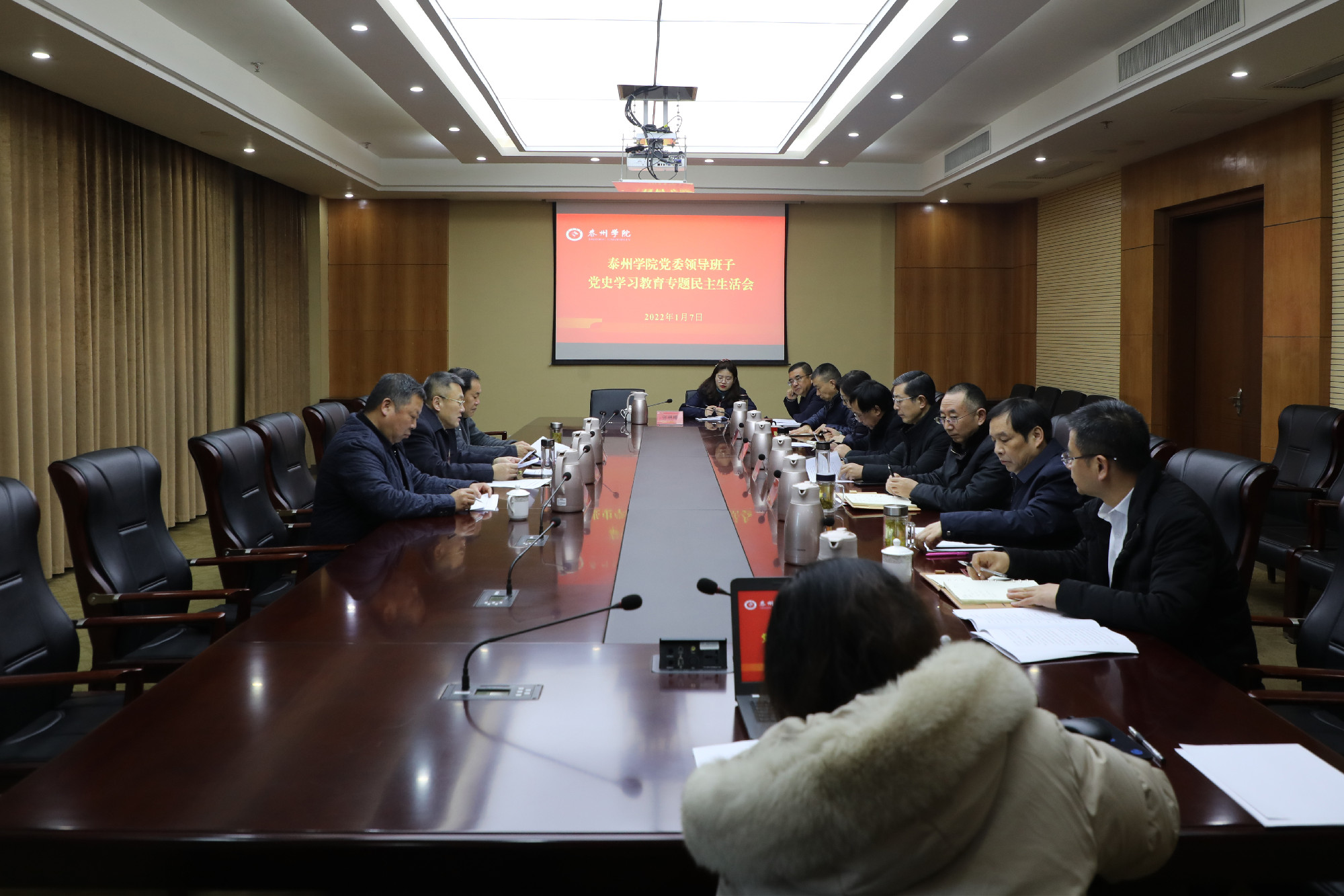 1月7日上午,校党委领导班子在行政楼1605会议室召开党史学习教育专题民主生活会,校党委书记赵茂程主持会议并作总结讲话,泰州市委教育工委派出指导组组长管文华一行到会指导。