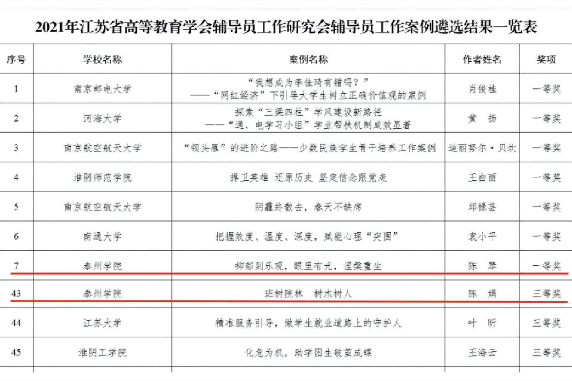 近日,江苏省高等教育学会辅导员工作研究委员会公布了2021年全省高校辅导员工作案例遴选结果,bat365人文学院辅导员陈琴的工作案例《抑郁到乐观 眼里有光 涅槃重生》获一等奖、船舶与机电工程学院辅导员陈娟的工作案例《班树院林 树木树人》获三等奖。本次评选经学校推荐、形式审查、专家评审,最终遴选出一等奖12项、二等奖25项、三等奖37项,bat365系首次获得该奖项一等奖。