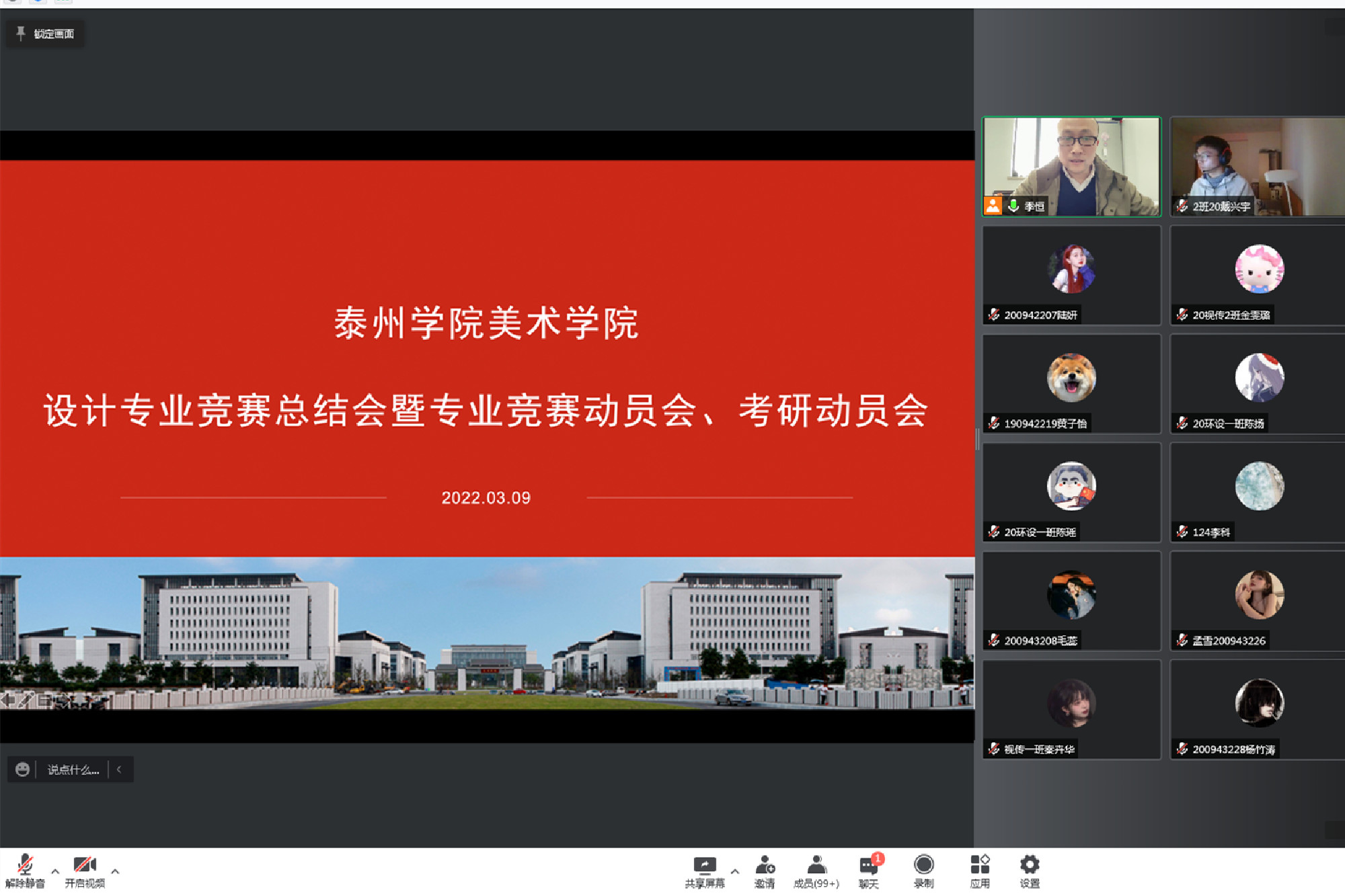3月9日,美术学院在线召开设计专业竞赛总结会暨专业竞赛动员会、考研动员会。学院相关负责人、视觉传达设计系和环境设计系全体教师、2019级和2020级设计专业学生参加本次会议,动员会由学院副院长季恒主持。