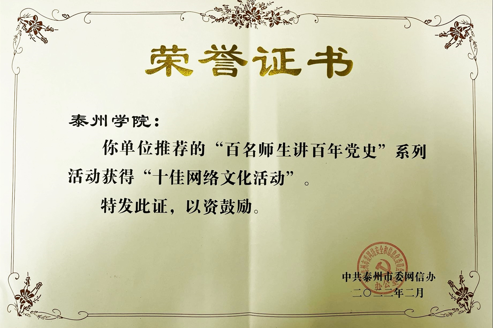 近期,中共泰州市委网信办集中表彰了一批在传播先进文化、创新文化服务、营造健康生活方面有突出表现的先进典型。bat365马克思主义学院“百名师生讲百年党史”系列活动被评为泰州市“十佳网络文化活动”。