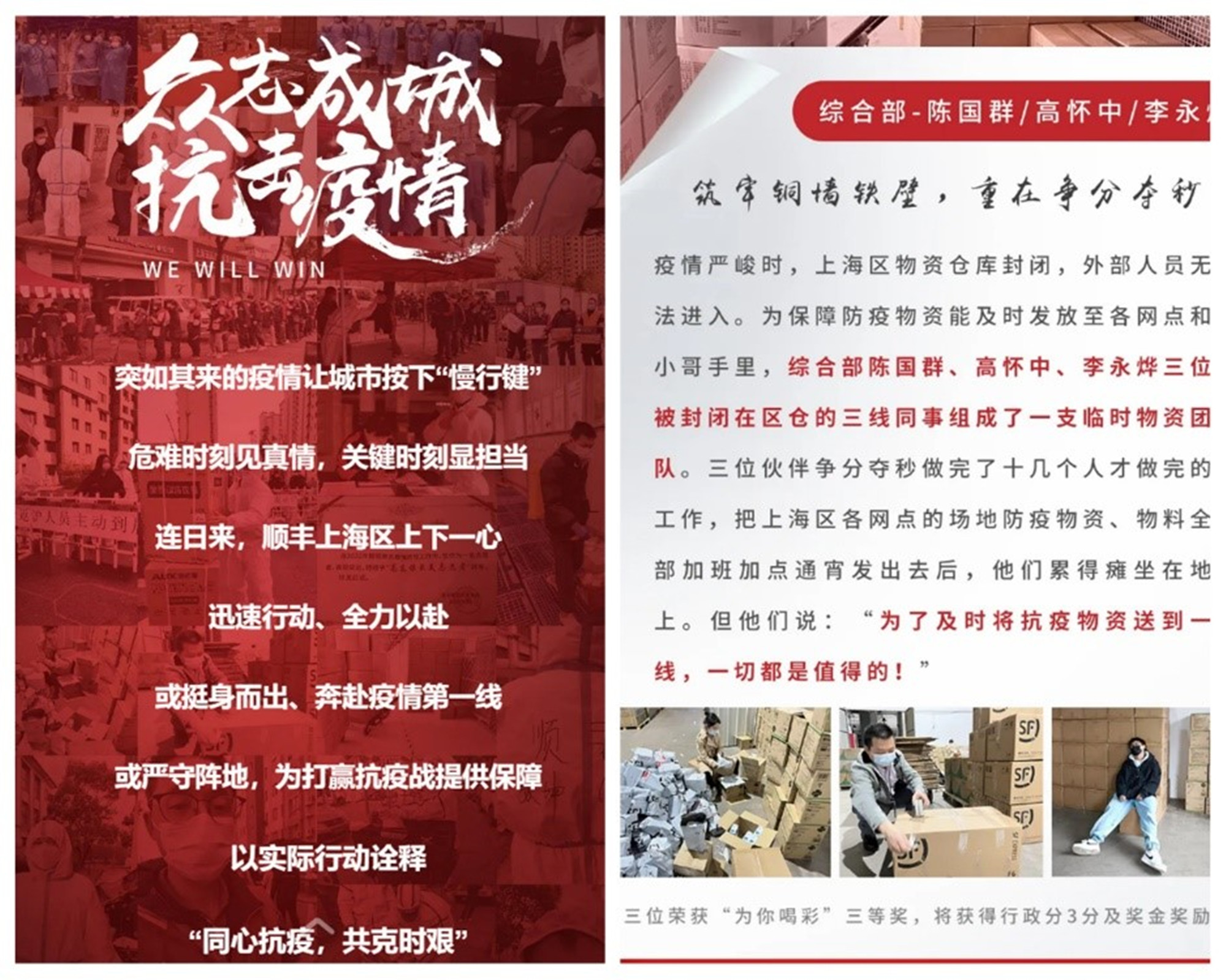 三月以来,上海地区疫情严峻,顺丰物流上海区物资仓库封闭,外部人员无法进入。为保障防疫物资能及时发放至各网点和小哥手里,在顺丰速运集团上海区综合部物资组实习的高怀中、李永烨和另外一位被封闭在区仓的三线同事组成了一支临时物资团队。三位伙伴争分夺秒做完了十几个人才做完的工作,把上海区各网点的场地防疫物资、物料全部加班加点通宵发出去后,他们累得瘫坐在地上。正是由于他们优异的表现,顺丰集团授予他们“为你喝彩”三等奖,并给予奖励。