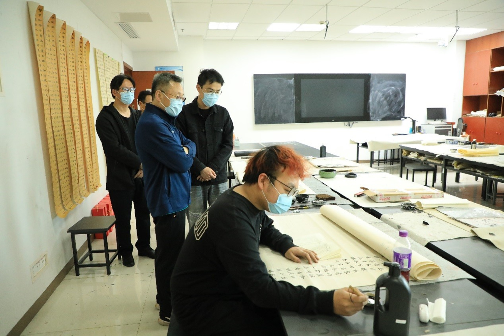 谢德是美术学院国画老师,刘仪通是书法老师,为确保学生毕业设计、大创项目和部分课程实践顺利完成,他们主动要求入校,指导同学创作。2019级书法学专业杨雯靖同学的创业项目“篆刻艺术走进大众生活”的筹备、曾入选“中国书法年展”的孙小慧同学个展筹备、2020级同学为省书法展投稿作品打磨、2018级同学的毕业创作等,在几位老师的指导下,都没有因为疫情而受影响。
