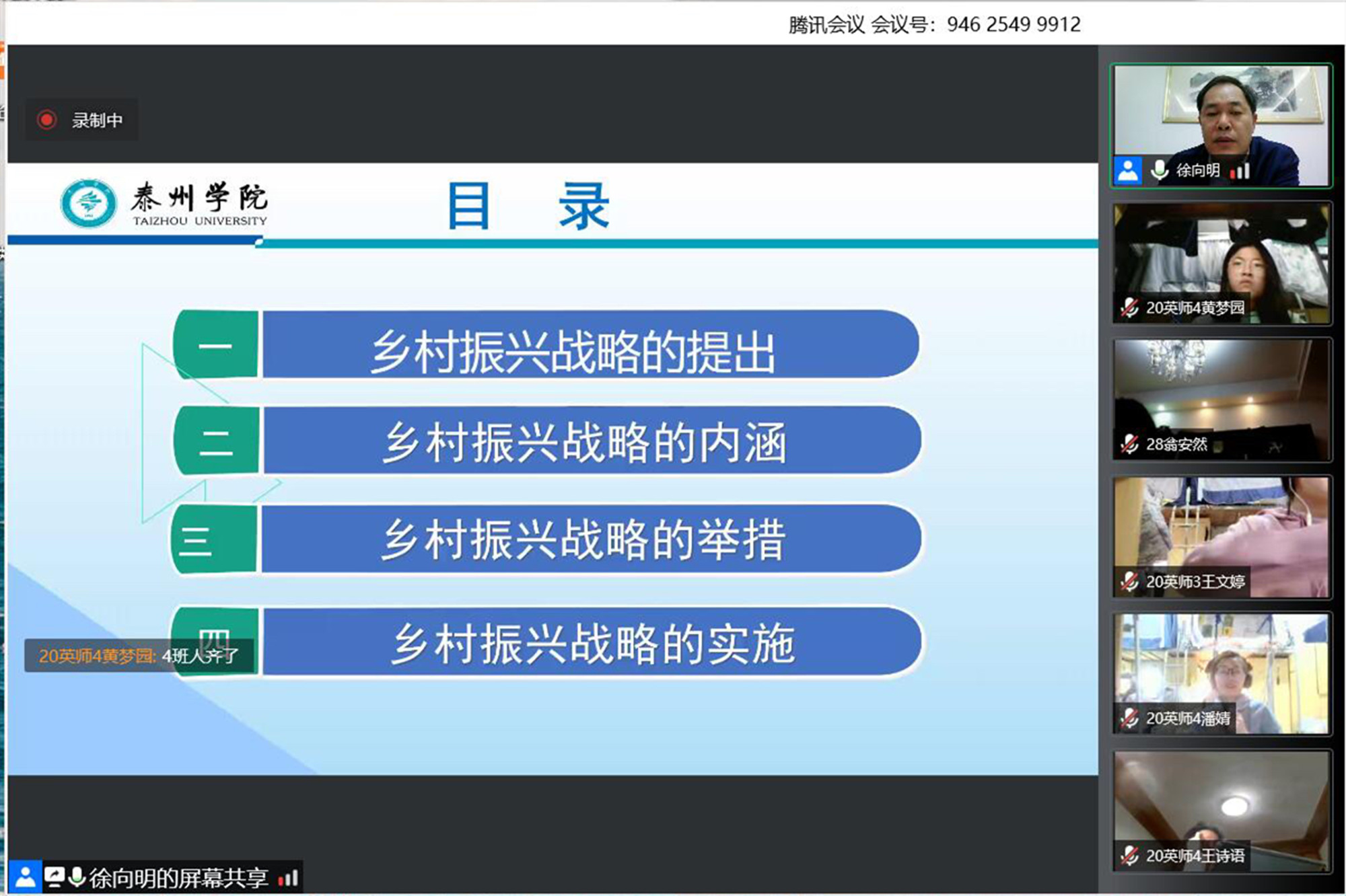 4月29日晚,党委副书记、校长徐向明为2020级英语师范专业本科生线上讲授“牢记使命勇担当 振兴乡村做贡献”专题思政课。