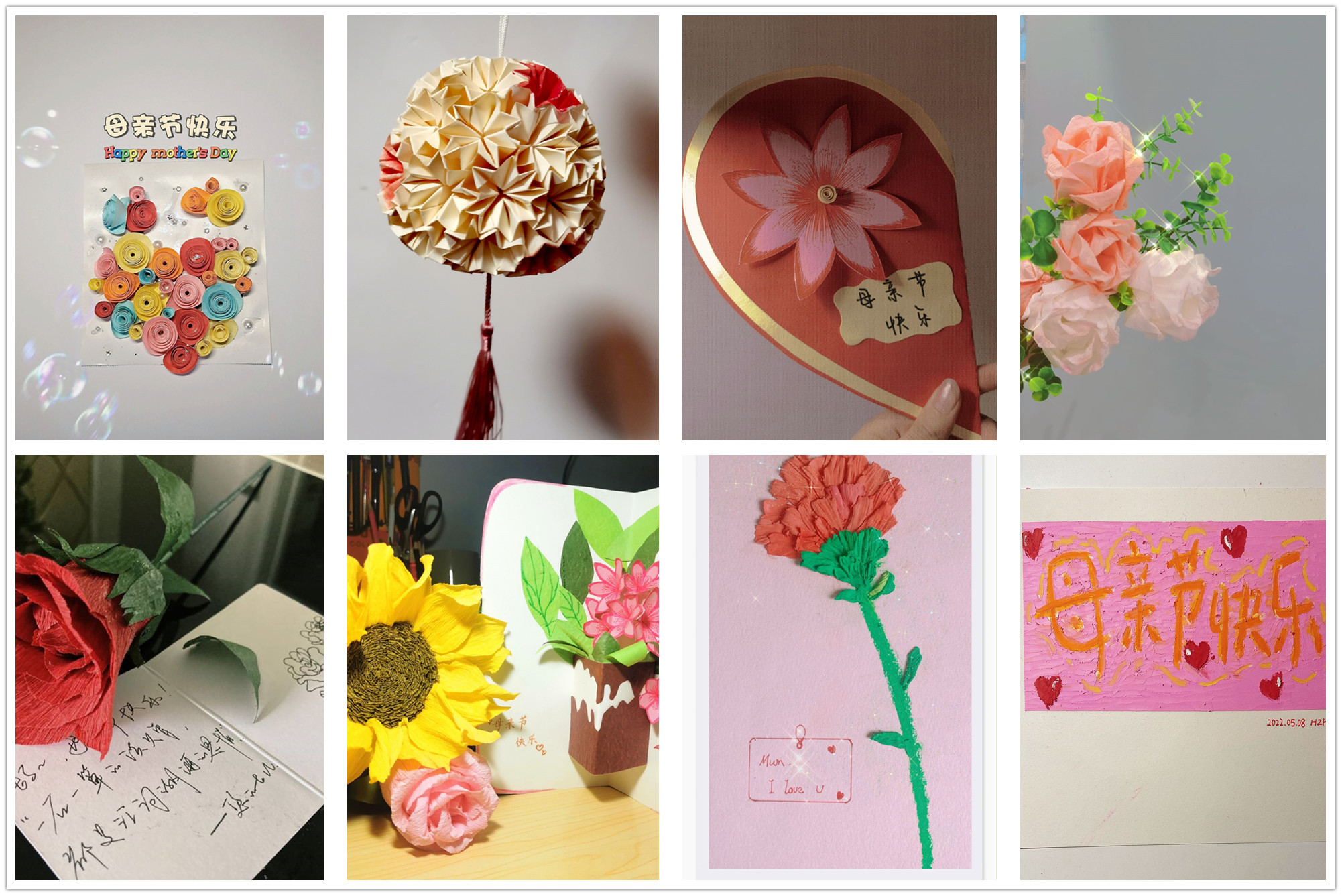 活动分为线上线下两个部分。在线上,学生们通过微信形式向母亲表达感恩赞美之情,可以是给母亲写一段深情的文章,也可以是专门为母亲录制的一段视频,也可以是为母亲画的一幅画;在线下,学生们用彩纸折出康乃馨、千纸鹤、爱心、百合、玫瑰等作品,并在上面写下对母亲的三行寄语。